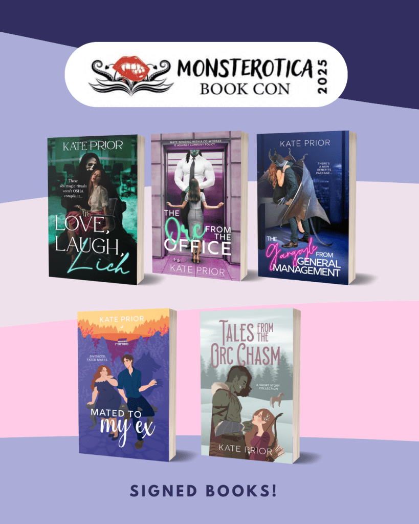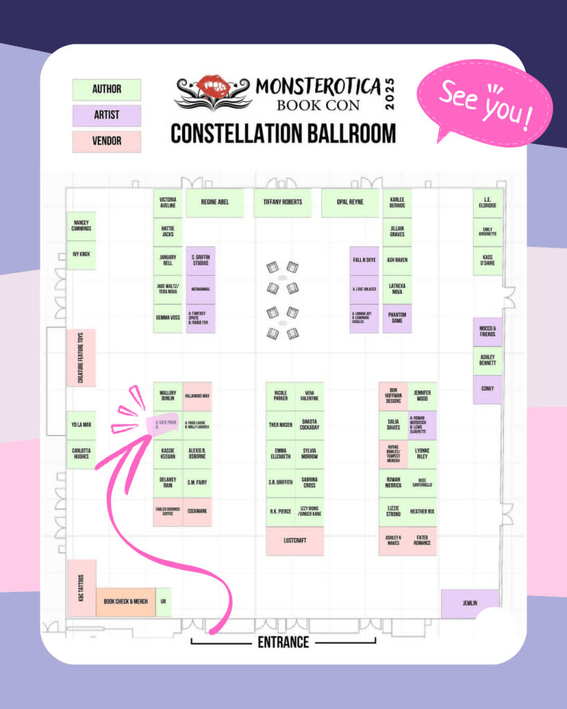 I’m so excited to be attending Monsterotica 2025, in Baltimore this weekend! I can’t wait to meet readers there. I’ve added a little map of the convention’s floorplan, the hot pink highlight is my table. I’ll have signed copies of all my monster romances, bookmarks, candles, stickers, and free brochures.